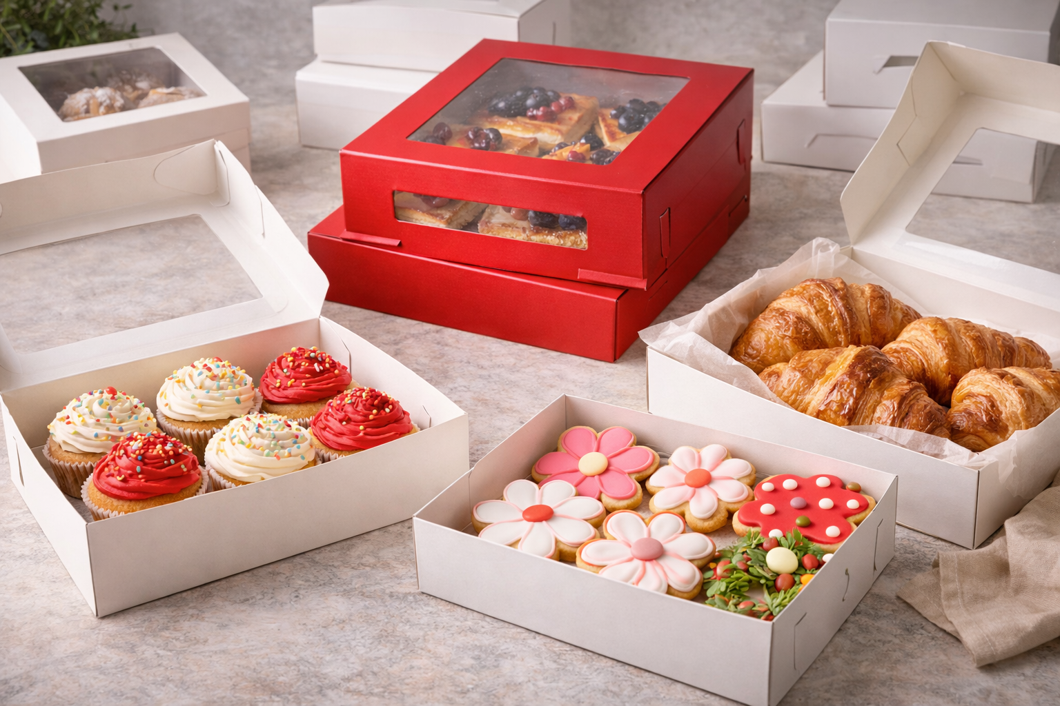 • Boxes for cakes, pastries, and sweets, designed to keep your baked goods safe and attractive.